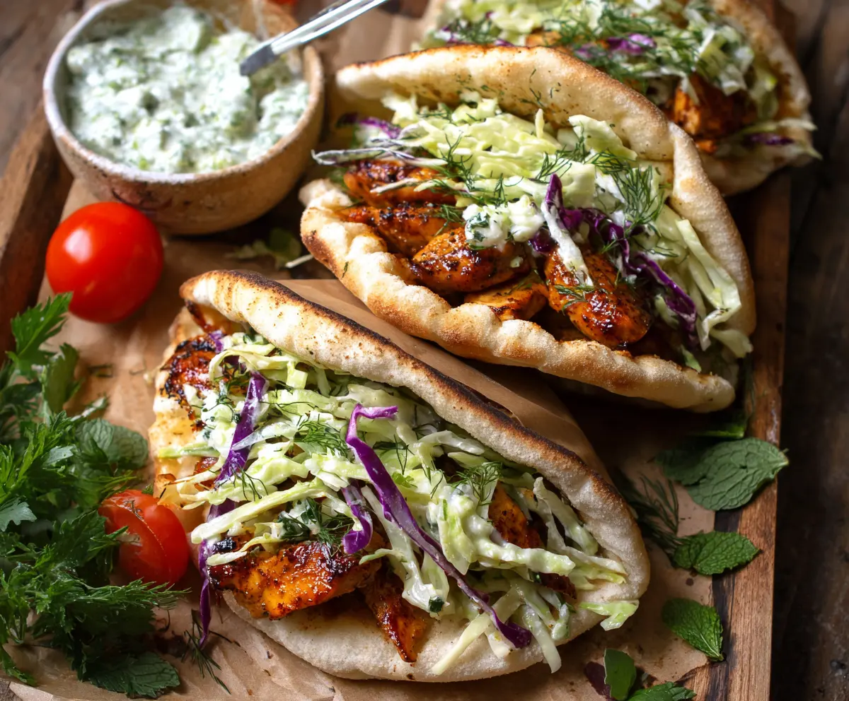 Now that everything is ready, warm the pita breads. Take each pita and fill it with slices of the baked chicken and a generous portion of the fresh herb ranch slaw. Don’t be shy about adding lots of slaw—it’s the star of the show!