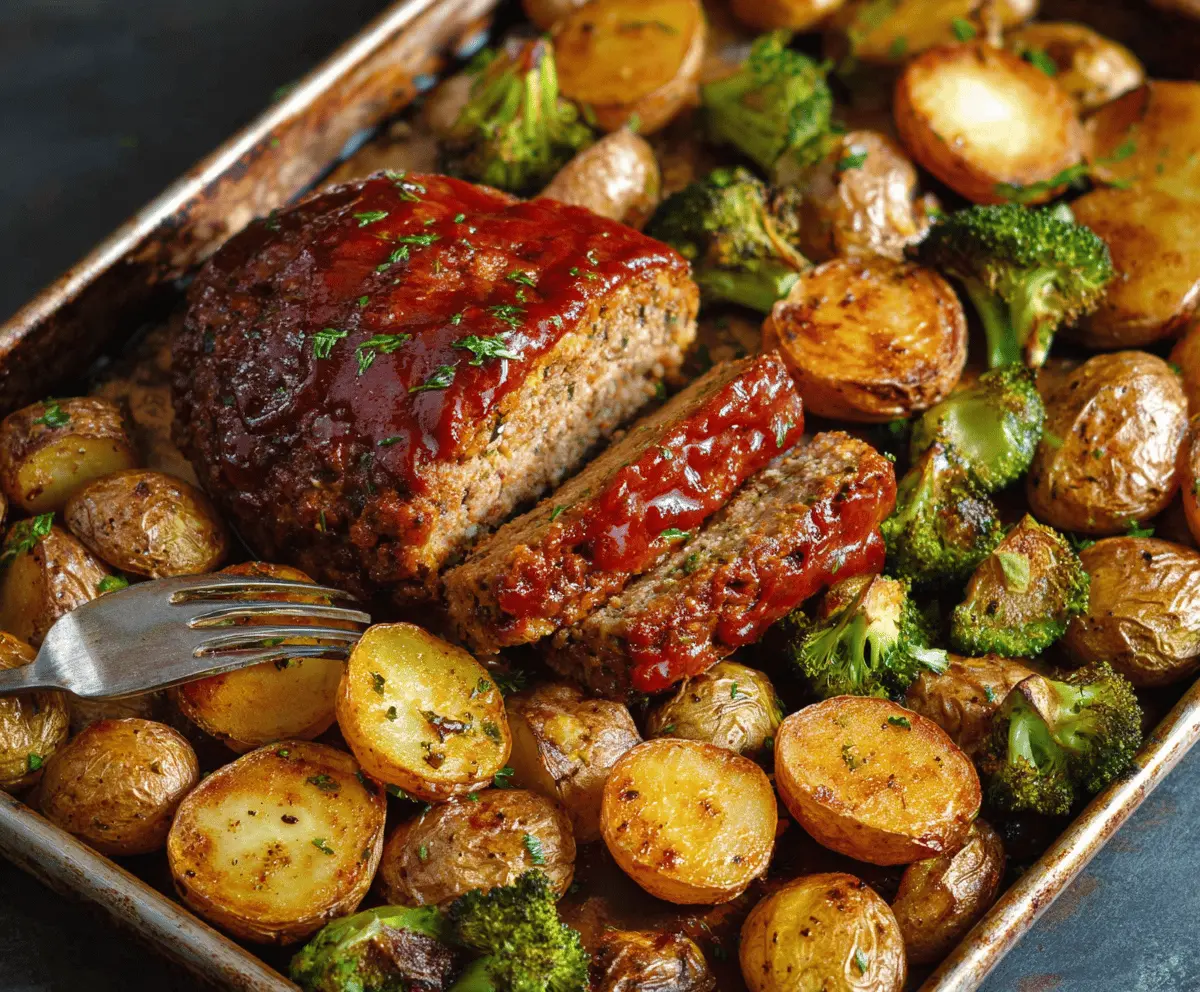 Delicious sheet pan meatloaf with roasted potatoes and vegetables ready to serve