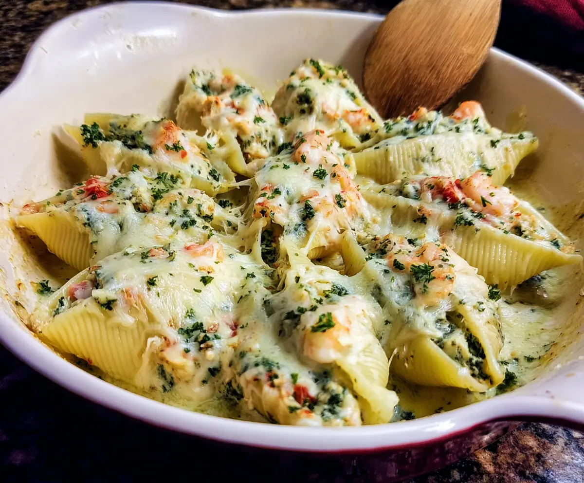 These Shrimp and Spinach Stuffed Shells are a fun and tasty dinner! Big pasta shells are filled with a creamy mix of shrimp and leafy spinach, then baked in a cozy tomato sauce.