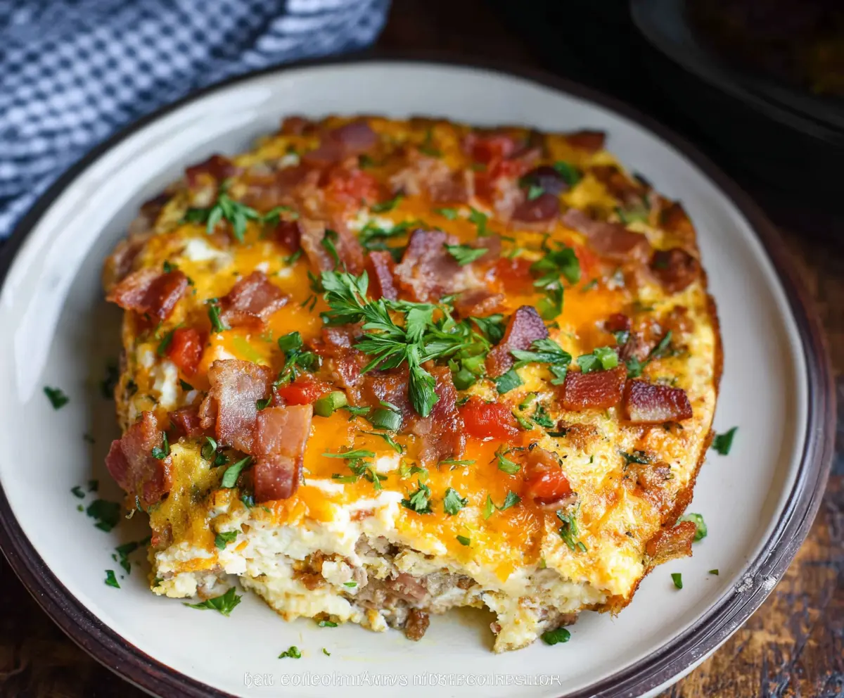 Once cooked, carefully remove the lid and garnish your casserole with chopped green onions and any extra bacon you’d like. Slice into pieces and serve warm for a delightful breakfast that everyone will love!