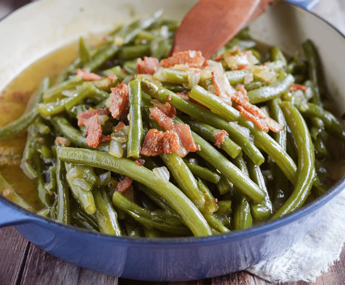 These Southern Style Green Beans are a comforting side dish, packed with flavor and simplicity. Cooked with tender beans, savory bacon, and a hint of garlic, they bring warmth to any meal.