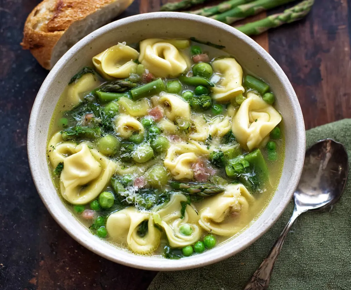 Enjoy your fresh, vibrant Spring Tortellini Soup bursting with the flavors of peas and asparagus!