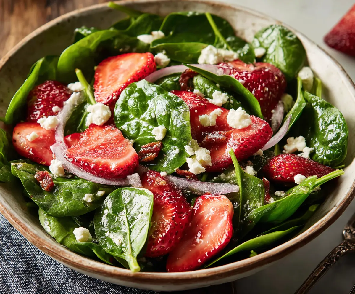 This Strawberry Spinach Salad is a refreshing mix of sweet strawberries and fresh spinach. Topped with crunchy nuts and tangy dressing, it’s a tasty treat for any meal!