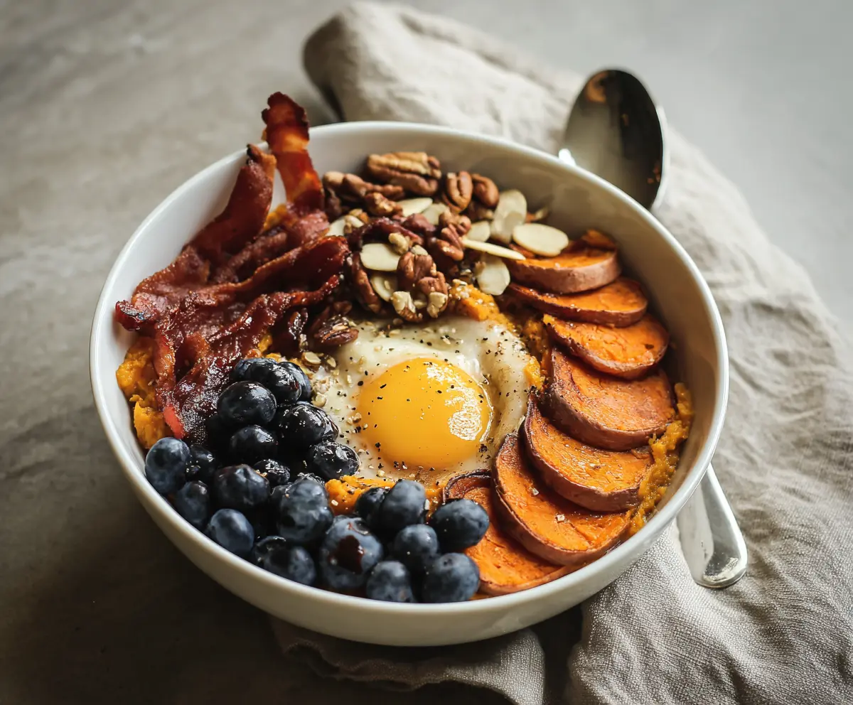 Your warm and wholesome Sweet Potato Breakfast Bowl is ready to enjoy! Dig in and start your day on a nutritious note.