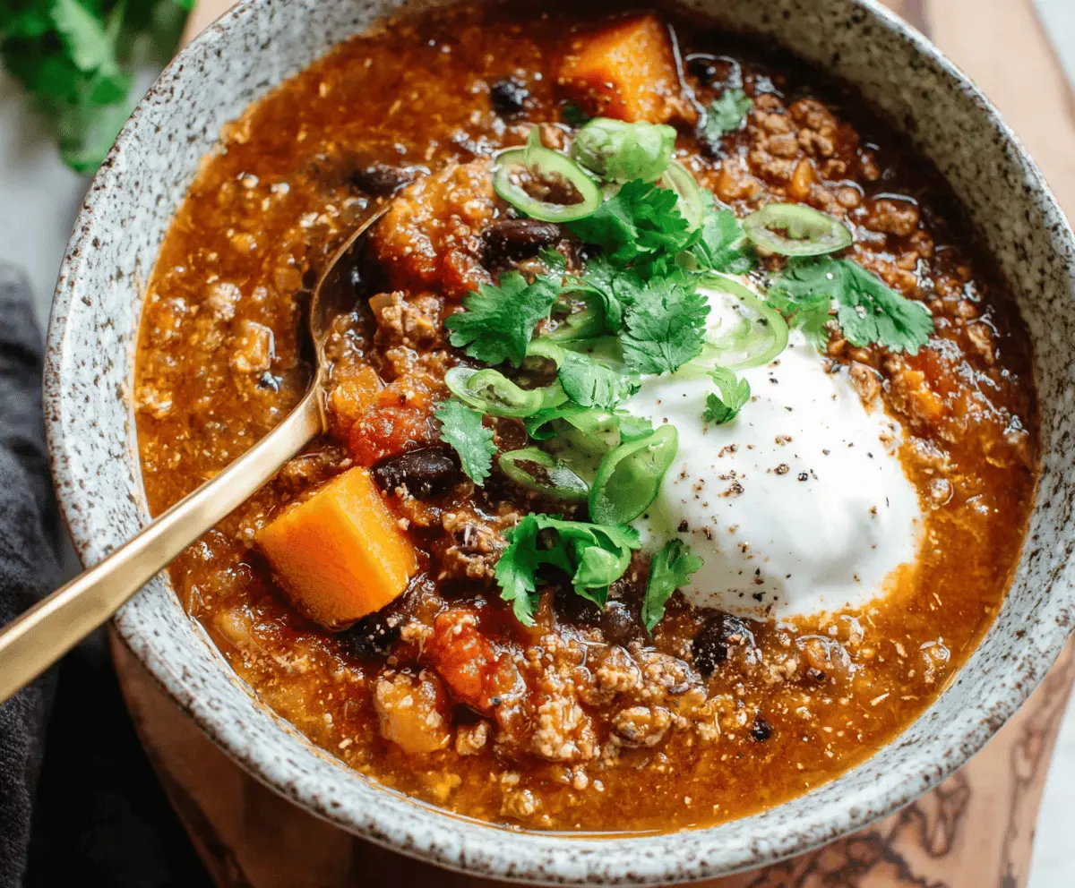 Enjoy a warm and comforting bowl of Sweet Potato Turkey Chili, perfect for those cozy evenings!