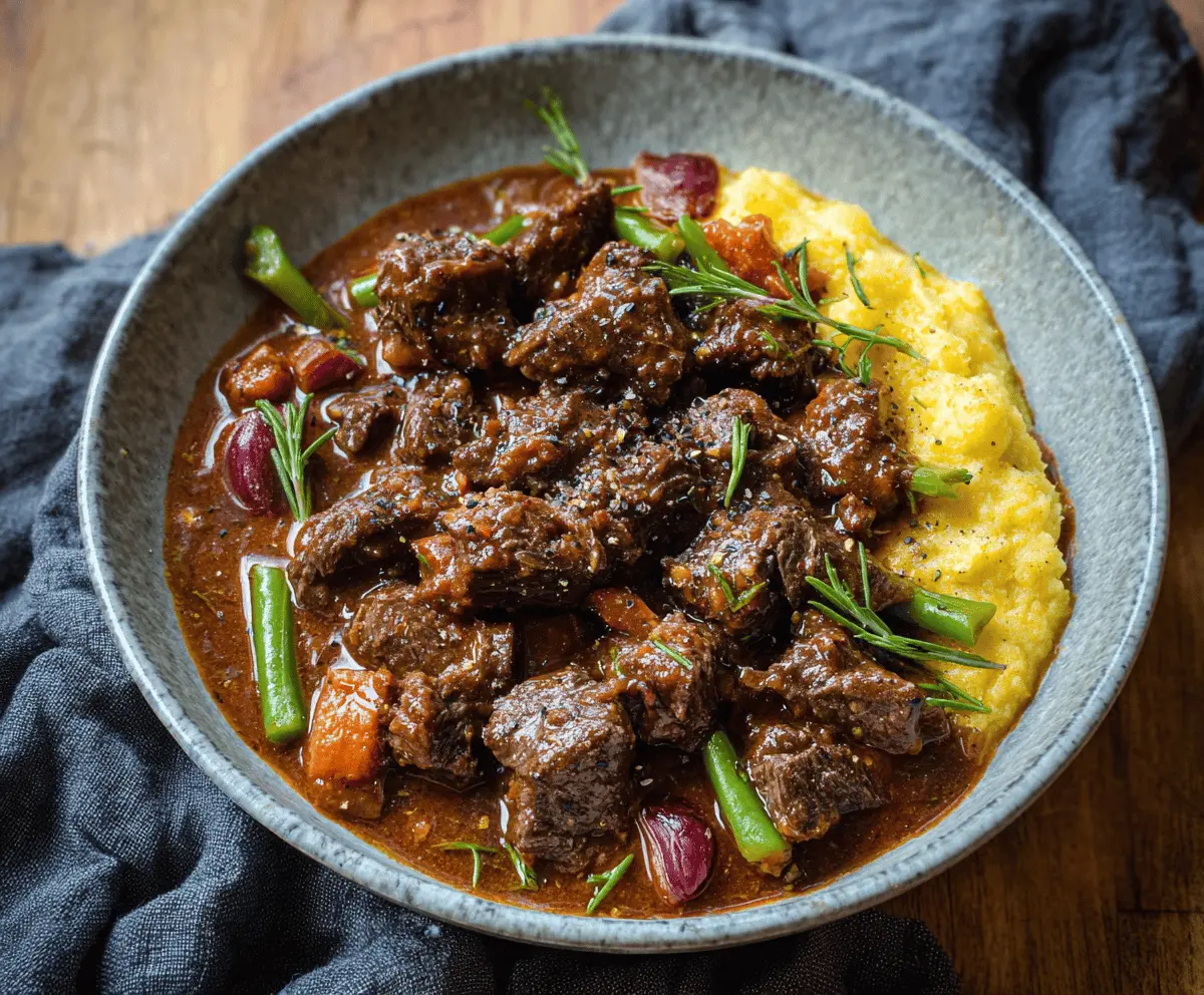 Before serving, remember to remove the bay leaves and discard them. Ladle the rich, hearty stew over a bed of creamy polenta or soft mashed potatoes.