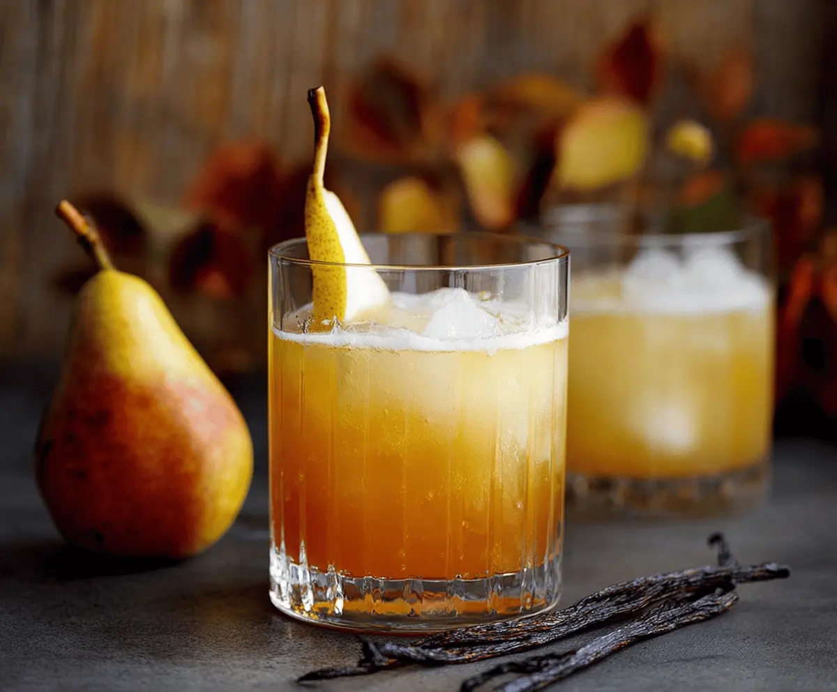 Strain the cocktail into your ice-filled rocks glass. For a finishing touch, garnish with a lovely slice of fresh pear and, if you’re feeling fancy, a vanilla bean pod to add some extra aroma and elegance.