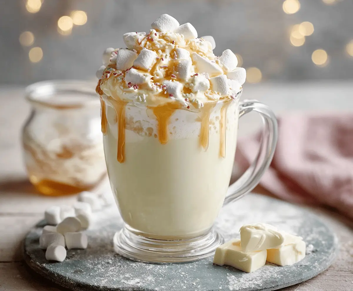 Serve warm and enjoy your creamy, dreamy white hot chocolate right away!