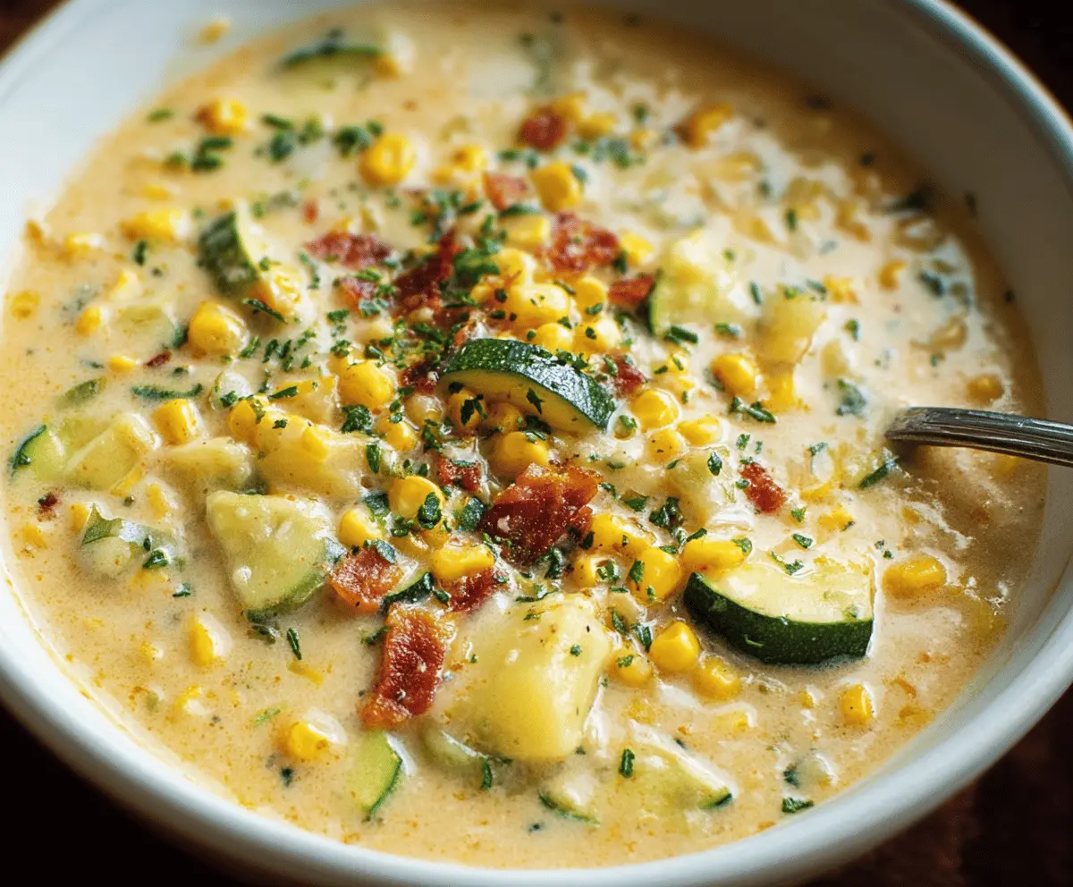 Finally, ladle your delicious chowder into bowls, garnish with fresh herbs, and serve hot. It pairs wonderfully with some crusty bread on the side. Enjoy your creamy, fresh, and flavorful Zucchini Corn Chowder!